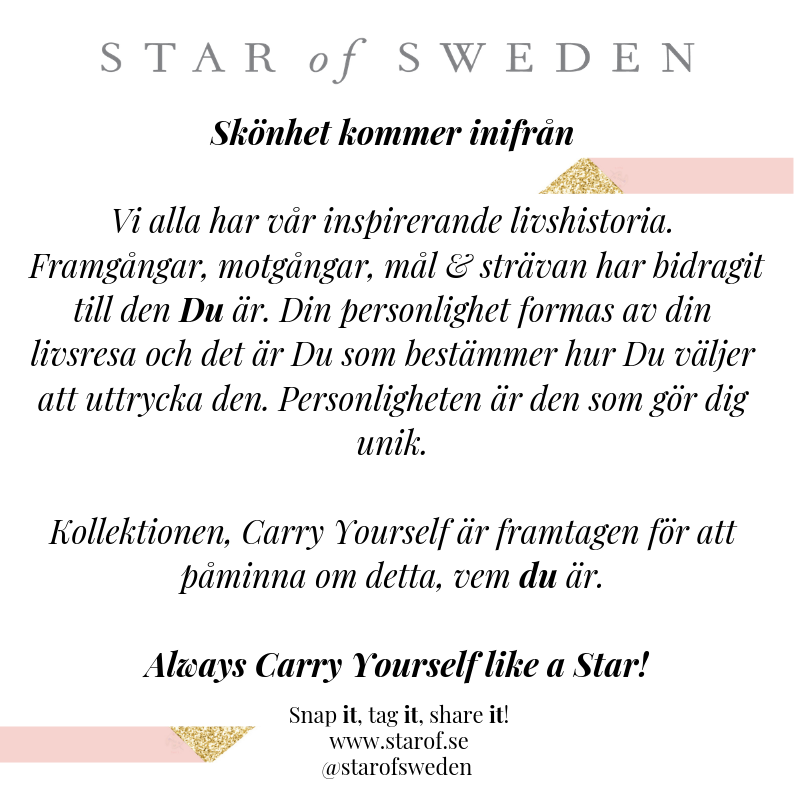 Star of Sweden is a fast-growing Scandinavian design brand of fashion-forward jewelry. Special designed gift boxes with the innovative gift concept Carry Yourself. So, you get something a little bit extra to carry with you. So, the jewelry comes with a designed box and a message to the wearer including a gift note. The note explains the meaning behind the chosen piece; how you Carry yourself.